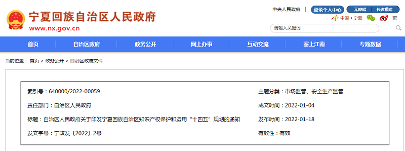 自治区人民政府中国足彩网:印发宁夏回族自治区知识产权保护和运用“十四五”规划的通知
