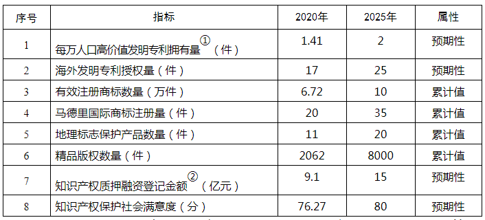 ——知识产权创造量质齐升。在九个重点产业中培育一批高价值发明专利,每万人口高价值发明专利拥有量达到2件,专利合作条约PCT专利申请量年均增长率达到10%。有效注册商标总量达到10万件。地理标志保护产品、地理标志商标和农产品地理标志数量累计分别达到20件、40件和100件。软件和其他版权作品登记量年均增长率达到20%,精品版权数量达到8000件。