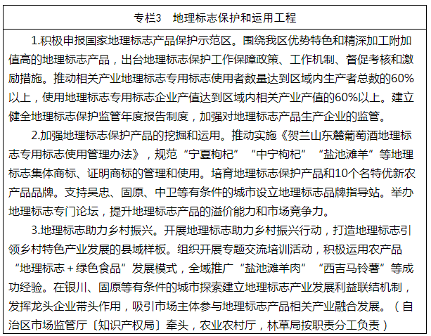3.建设一批高价值的优质品牌。建立健全品牌推进工作体系,引导企业树立和提高品牌意识,加强质量管理、品牌资产管理和名品名牌文化建设。加快实施区域品牌培育工程,推动设立商标品牌创新创业基地,在现代农业、先进制造业、文化旅游业等领域培育一批具有市场竞争力、国际影响力的知名商标品牌。强化商标品牌培育帮扶指导,支持商标品牌指导站建设。加强对“贺兰山东麓葡萄酒”“宁夏枸杞”“盐池滩羊”等重点地理标志产品的宣传力度,打响地理标志知名品牌。探索建立黄河几字湾跨区域农业产业化联合体,培育“宁夏牛奶”“六盘山牛肉”等农产品区域公用品牌。扩大“大漠星空”“塞上江南”等宁夏区域公共品牌的影响力。(自治区党委宣传部〔版权局〕,发展改革委、工业和信息化厅、农业农村厅、商务厅、文化和旅游厅、市场监管厅〔知识产权局〕,广电局,林草局按职责分工负责)
