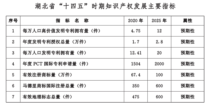 ——知识产权创造量质齐升。每万人口高价值发明专利拥有量年均增长超过20%,达到12件;年度发明专利授权总量年均增长超过10%,达到2.8万件;每万人口发明专利拥有量年均增长超过10%,达到20件;年度PCT国际专利申请量稳步增长,保持全国第一方阵;有效注册商标量年均增长超过8%,达到100万件以上;马德里商标国际注册总量年均增长超过11%,达到600件以上;有效地理标志总量年均增长超过4.5%,达到600件以上;版权作品登记量年均增长超过19%,达到12万件以上。