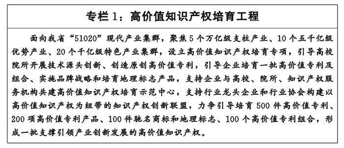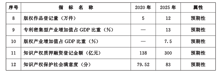 ——知识产权运用效益显著。加强高价值知识产权运营平台、知识产权交易平台建设,推动知识产权转让、许可、资本运营高效运作,知识产权保险、证券化、信用贷款等金融服务充分发展。专利密集型产业增加值占GDP比重、版权产业增加值占GDP比重分别达到13%和7.5%;市场主体运用知识产权参与市场竞争的能力明显提高;高校院所的科研活动基本实现知识产权全过程管理;知识产权质押融资登记金额年均增长超过16%,达到300亿元。地理标志与特色产业发展、生态文明建设、历史文化传承以及乡村振兴有机融合,培育发展200个以上在全国具有较高知名度、带动能力强的知名品牌。