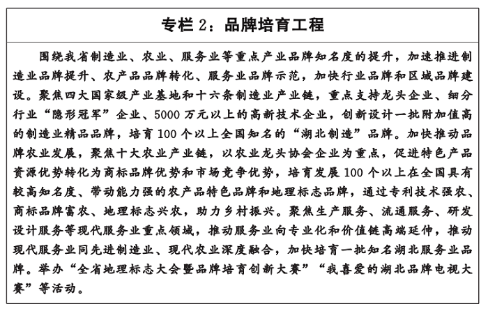 培育高知名度商标、地理标志。有力实施品牌培育工程,形成品牌聚合示范效应。以全省重点产业、地方特色产业、“一县一品”“一业一品”为重点,引导企业开展商标注册申请和地理标志产品认定,培育涉农商标和地理标志商标,加强地理标志产品保护示范区建设,助力乡村振兴。以重大宣传活动为抓手,加大湖北品牌推广力度,增强全社会特别是市场主体商标品牌意识以及湖北品牌的美誉度和影响力。引导企业开展海外品牌布局,通过申请注册、海外收购等方式,形成一批具有国际影响力的商标和地理标志品牌。坚持市场导向,多途径提高市场主体培育、保护和运用商标专用权能力。聚集商标品牌服务资源,增强商标业务受理窗口服务功能,建设一批商标品牌指导站,全方位提高商标品牌服务水平。