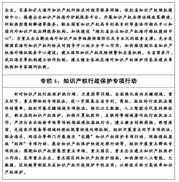 强化行政保护。完善专利、商标、著作权、地理标志、植物新品种权、商业秘密、集成电路布图设计专有权等领域知识产权执法监管机制,加快推进专利侵权纠纷行政裁决示范建设试点省建设。加强知识产权行政执法队伍建设,建立行政保护技术调查官制度,提高执法队伍专业化、信息化、规范化水平。深入开展关键领域、重点环节、重点群体行政执法专项行动,严厉打击重复侵权、故意侵权行为,坚决遏制垄断和不正当竞争行为,严格规范知识产权市场秩序。申报建设中国(湖北)知识产权保护中心,建强建好中国(武汉)知识产权保护中心、中国武汉(汽车及零部件)知识产权快速维权中心,支持襄阳、宜昌等有条件的地区申报建设保护中心,为湖北优势产业提供快速预审、快速确权、快速维权于一体的“一站式”综合服务。