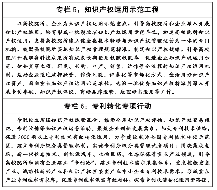 打造知识产权运用平台。支持建设若干聚焦产业、带动区域的运营平台,积极推进我省知识产权交易市场建设。鼓励社会资本投资设立专业化知识产权运营公司,开展知识产权收储、开发、组合、投资等服务,盘活知识产权资产,加强具有自主知识产权的新技术新产品推广应用。支持国家知识产权运营公共服务平台高校运营(武汉)试点平台、中国节能环保国家级产业知识产权运营中心建设。加强国家知识产权运营体系各平台间的互联互通,为已获取专利技术的中小企业提供专利转让、许可、质押等业务办理的绿色通道。深入实施地理标志运用促进工程,深化地理标志产业经济融合发展。支持建好华中国家版权交易中心,打造“版权+互联网+金融”运营模式。扩大长江科技创新要素大会影响力,打造湖北展示交易品牌。培育建设一批产业特色鲜明、优势突出,具有国际影响力的专业化知识产权运营机构。发展“互联网+”知识产权服务等新模式,探索大数据、人工智能、基因技术等新领域、新业态知识产权运营机制。健全运营交易规则,加强运营平台监管,规范运营交易行为。推动军民知识产权转移转化,促进军民融合深度发展。