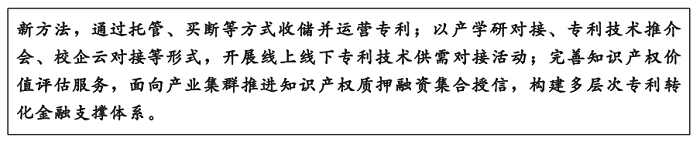 促进知识产权运用。加快培育知识产权强企、强校、强所。引导企业加大知识产权投入,提升企业知识产权战略管理能力。推行企业知识产权管理国家标准,加强知识产权全过程管理。深入开展企业知识产权试点示范和优势培育工作,引导企业开展形式多样的知识产权资本化运作。鼓励国有企业向中小企业共享成熟专利技术,降低中小企业专利技术获取门槛。支持国有企业和高校院所建立专利分级分类筛选机制,围绕重点产业建立“专利池”。支持具有竞争优势的中小企业以知识产权为纽带形成有利于创新的产业生态,大力培育拥有高价值知识产权的企业和科创型上市公司,提升源头创新质量。推动企业、高校、科研机构健全知识产权管理体系,鼓励高校、科研机构建立专业化知识产权转移转化机构。支持高校院所加强技术转移队伍建设,或者委托服务机构提供专业服务支撑。