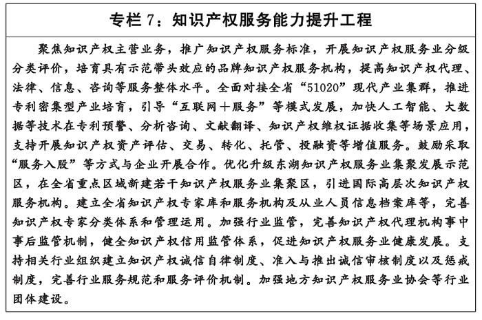 加快提升知识产权公共服务。完善知识产权公共服务网络,健全公共服务支持创新工作机制,地市级公共服务机构覆盖率力争达到50%,鼓励有条件的县(市、区)设立综合性公共服务机构。加强技术与创新支持中心(TISC)、高校国家知识产权信息服务中心建设。推进知识产权专题数据库建设,打造以知识产权展示交易为核心、线上线下相结合、立足中部、辐射全国的运营服务网络。建立知识产权服务对接重点产业、重大项目工作机制。加强统筹协调,优化知识产权公共服务考核和管理机制。完善“互联网+”公共服务模式,提升知识产权公共服务系统化、模块化和智能化。支持国家知识产权局专利局专利审查协作湖北中心发展,鼓励提升专利审查质效,融入重大经济科技活动,服务地方经济社会发展。