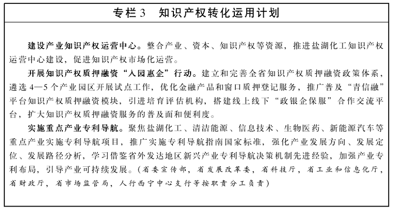 1.推进知识产权与产业融合发展。着力培育知识产权密集型产业,研究制定专利密集型产业培育目录,探索专利、商标、地理标志等多类型知识产权协同运用支撑产业创新发展机制,提高知识产权对经济发展、区域发展、产业发展的贡献度。围绕盐湖锂电、清洁能源等重点产业组织实施专利导航工程,为产业发展和技术创新提供支撑。支持高校和科研院所技术转移中心、知识产权运营中心等知识产权转移转化平台建设,鼓励向中小微企业转让、许可、作价入股专利技术,提高专利技术市场化运营能力,实现技术产业化。(省发展改革委,省教育厅,省科技厅,省工业和信息化厅,省市场监管局,省统计局等按职责分工负责)