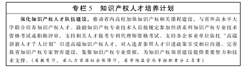 2.加强知识产权人才队伍建设。坚持党管人才原则,结合实际逐步建立健全我省知识产权人才政策体系。引进和培养高端知识产权复合型人才,加强对科技研发人员、知识产权管理人员、知识产权服务人员的多层次系统化培训,努力建设一支数量充足、结构合理、素质优良的人才队伍。加强知识产权教育培训,探索支持知识产权专业课程设置,鼓励有条件的高等院校开设知识产权选修课程。建立知识产权专家决策咨询团队,充实区域性、产业型的知识产权智库,为知识产权发展提供坚强的人才保障。(省教育厅,省人力资源社会保障厅,省市场监管局等按职责分工负责)