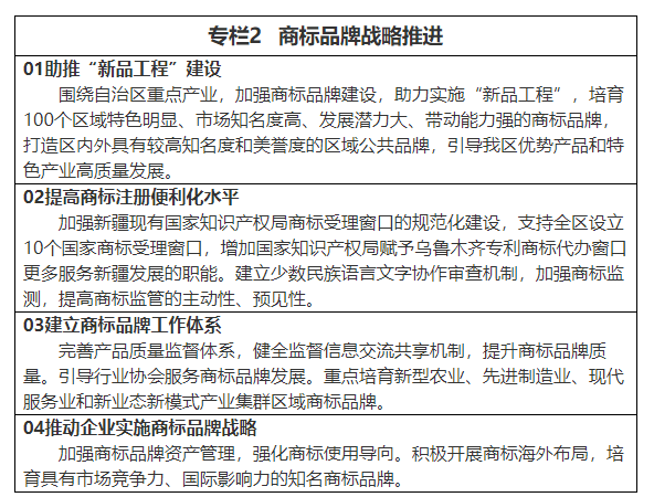 2.推进特色知识产权品牌建设。加强对非物质文化遗产、民间文艺、传统知识的开发利用,推进文化创意、设计服务与相关产业融合发展,提升品牌社会信誉度。引导企业在国际贸易中使用自主商标,积极注册国际商标,重点打造商标品牌建设,着力提升品牌形象和价值。深入实施旅游兴疆战略,培育特色旅游品牌,助力发展文化和旅游产业,大力推进“文化润疆”,筑牢共同团结奋斗的思想基础。