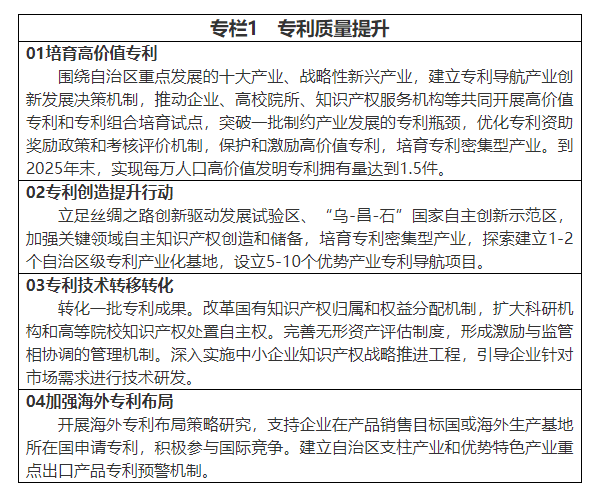 培育高价值专利,全区企业、科研院所、高等学校要激励科研人员发明创新,把高价值发明专利纳入科研人员奖惩考核体系,建立专利申请诚信档案,持续开展专利申请质量监测与反馈。提升专利代理质量,深化专利代理领域“放管服”改革,提高行业管理水平。强化竞争机制和行业自律,加大对代理机构和代理师的执业诚信信息披露力度。针对专利代理机构的代理质量,构建反馈、评价、约谈、惩戒机制。提高专利运用效益,加快知识产权运营公共服务平台体系建设,为专利转移转化、收购托管、交易流转、质押融资、专利导航等提供平台支撑。提升专利保护水平,支持企业在产品销售目标国或海外生产基地所在国申请专利,积极参与国际竞争,建立支柱产业和战略性新兴产业重点出口产品专利预警机制。