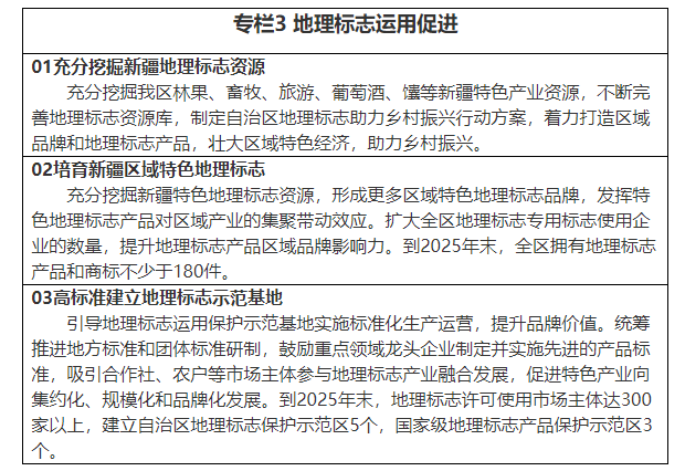 5.加强地理标志保护。将地理标志运用促进工作融入地方经济社会发展大局,加大地理标志运用促进政策扶持力度,建立并实施地理标志产品产值统计制度,全面反映地理标志产业发展总体状况;支持各地围绕地理标志出台专项扶持奖励政策措施;加强地理标志保护,积极创建地理标志产品保护示范区,推动地理标志高水平保护、高标准管理、高质量发展;推动地理标志特色产业融合发展,全面提升地理标志品牌价值,增强新疆地理标志国际影响力。